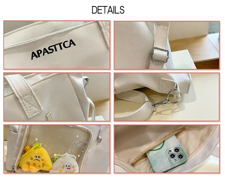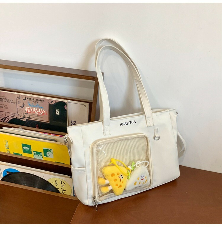 前の透明カバーに飾り板が入っていて、自分の好きな小物を入れることができるバッグです。 好きな芸能人や、アニメの写真 、缶バッジなどを入れるだけで、簡単に世界で1つたったのオリジナルバッグの完成です、毎日楽しく使える。