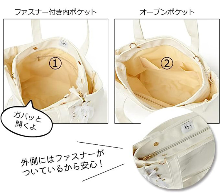 インナーバッグには、スマホや小物を収納できるオープンポケット、ファスナー付きの内ポケット付き。たっぷりのマチで収納力はばっちり。Dカンも二つついて、キーホルダーやチャームのデコに便利です。入口はファスナー付きで安心。